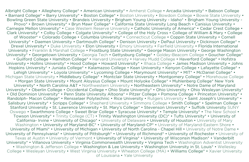 This list is a representative sampling. Bold text indicates colleges at which CDI Scholars have matriculated. Asterisks highlight colleges at which two or more CDI Scholars have matriculated. Updated 11/2025.